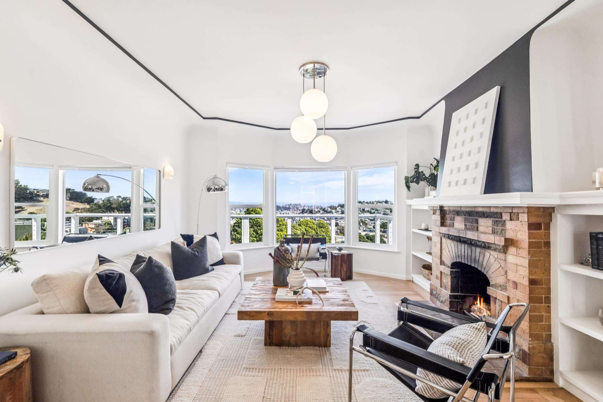 The light-filled open living and dining spaces flow seamlessly, warmed by a brick wood-burning fireplace and framed by a wall of windows showcasing city and bay views. The modern, professional eat-in kitchen offers more sweeping vistas and opens with sliding glass doors to a sun-drenched deck—ideal for entertaining. Thoughtfully designed, this kitchen is a blend of style and everyday functionality, featuring premium stainless steel appliances, updated quartz countertops and cabinetry (2022), an expansive breakfast area, and abundant storage. A sumptuous primary suite with walk-in closet and tiled en suite bath completes the main level.